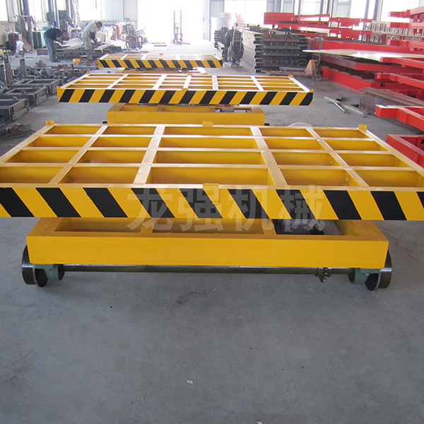 KPT系列電動平車由防爆電機(jī)連接減速機(jī)減速后,通過鏈輪鏈條旋轉(zhuǎn)而帶動電動平車滾輪在軌道上行走。電動平車運(yùn)行時,平臺下方固定連接坦克連一頭,另一頭固定在地平面的溝槽中,坦克連放平后厚度不會高出地平面,不會影響日常其他設(shè)備的運(yùn)作。電纜經(jīng)坦克鏈直接給電機(jī)供電。坦克鏈電纜的一端經(jīng)地面預(yù)埋管直接到控制柜中,另一端經(jīng)電動平車的固定裝置引入平車。該型電動平車的特點是臺面高度較低,裝卸重物容易,但運(yùn)行距離不能太長,一般不能超過50m,過長電纜重,坦克鏈會下垂。