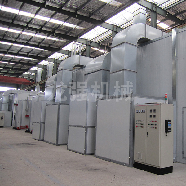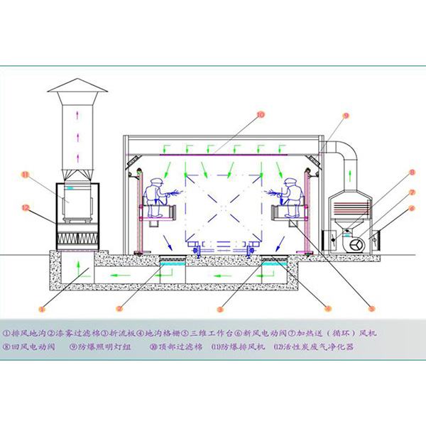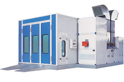 烤漆時,將風門調(diào)至烤漆位置,熱風循環(huán),烤房內(nèi)溫度迅速升高到預(yù)定干燥溫度(55℃-60℃)。風機將外部新鮮空氣進行初過濾后,與熱能轉(zhuǎn)換器發(fā)生熱交換后送至烤漆房頂部的氣室,再經(jīng)過第二次過濾凈化,熱風經(jīng)過風門的內(nèi)循環(huán)作用,除吸進少量新鮮空氣外,絕大部分熱空氣又被繼續(xù)加熱利用,使得烤漆房內(nèi)溫度逐步升高。當溫度達到設(shè)定的溫度時,燃燒器自動停止;當溫度下降到設(shè)置溫度時,風機和燃燒器又自動開啟,使烤漆房內(nèi)溫度保持相對恒定。 當烤漆時間達到設(shè)定的時間時,烤漆房自動關(guān)機,烤漆結(jié)束。